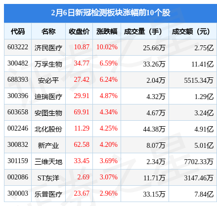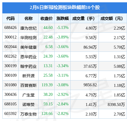 2月6日新冠检测板块较上一交易日下跌0.58%,康为世纪领跌。当日上证指数报收于3238.7,下跌0.76%。深证成指报收于11912.56,下跌1.18%。新冠检测板块个股涨跌见下表: