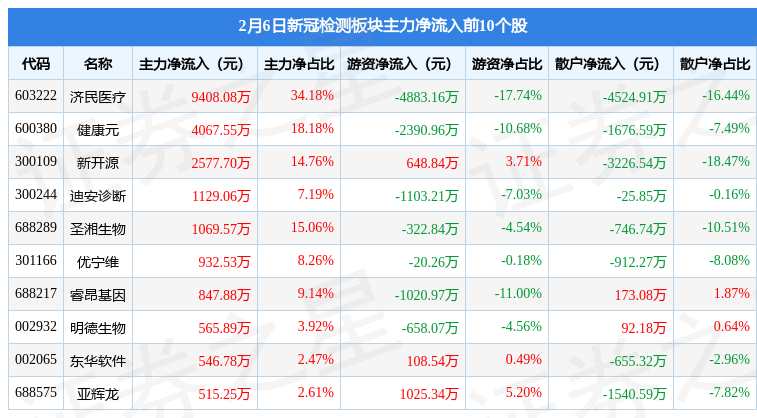 从资金流向上来看,当日新冠检测板块主力资金净流出6.87亿元,游资资金净流入2.14亿元,散户资金净流入4.73亿元。新冠检测板块个股资金流向见下表:
