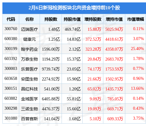 北向资金方面,当日新冠检测板块北向资金持股市值为797.89亿元,减持282.74万元。其中增持最多的是迈瑞医疗(300760),增持了0.5亿元。减持持最多的是新产业,减持了0.57亿元。新冠检测板块北向资金持股变动明细见下表: